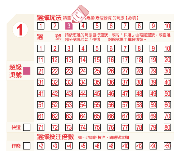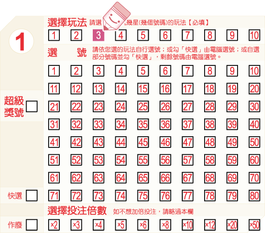 *1星」玩法代表您只必須填選一個號碼,作為您的選號;「2星」玩法代表您必須填選二個號碼,作